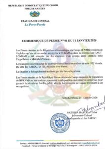 Les Forces armées de la République démocratique du Congo (FARDC) ont annoncé avoir repoussé, ce dimanche 11 janvier 2026, une attaque menée contre l’une de leurs unités déployées à Bukama, dans la province du Haut-Lomami.